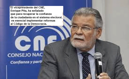 El vicepresidente del CNE, Enrique Pita, ha señalado que para recuperar la confianza de la ciudadanía en el sistema electoral, es esencial implementar reformas al Código de la Democracia.